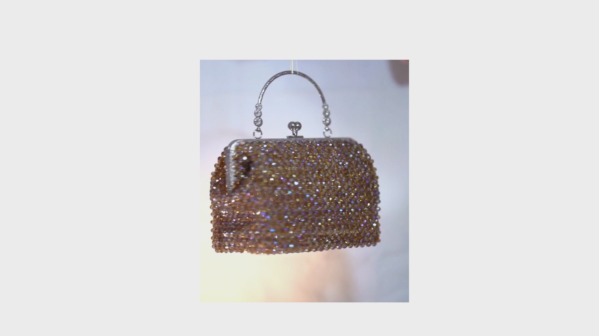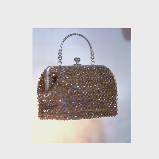 This luxurious amber-toned beaded bag is handcrafted with shimmering crystal beads and finished with a vintage-style silver handle and clasp. A perfect blend of sparkle and sophistication, ideal for festive occasions, weddings, or a classy evening out.